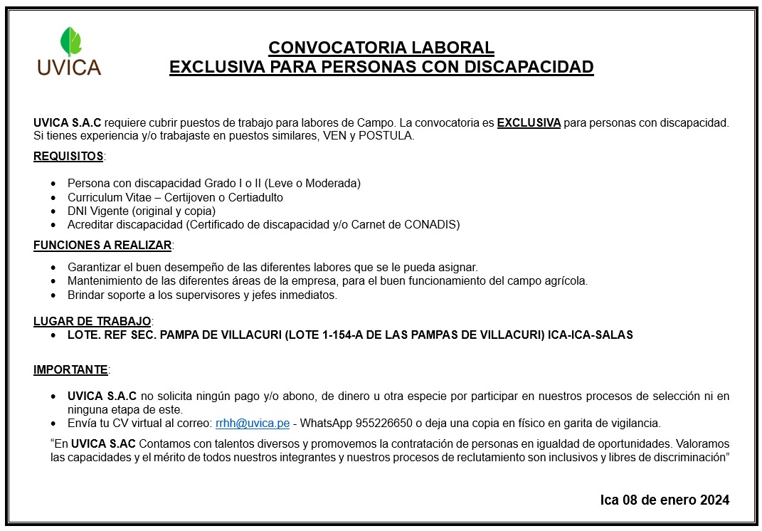 En UVICA SAC contamos con talentos diversos y promovemos la contratación de personas en igualdad de oportunidades. Valoramos las capacidades y el mérito de todos nuestros integrantes y nuestros procesos de reclutamiento son inclusivos y libres de discriminación.